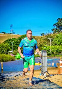 Foto: Divulgação/Marcos Maistro na saída da natação. Atleta ficou em primeiro lugar na Aquathlon Fitness, categoria 50-54 anos